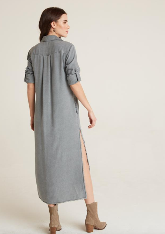 Effortless dressing from Bella Dahl. An easy to wear shirt dress crafted from their signature Soft Touch Tencel with roll tab sleeves and fray hem detailing. Pair with your favourite trainers and you're ready for your day.