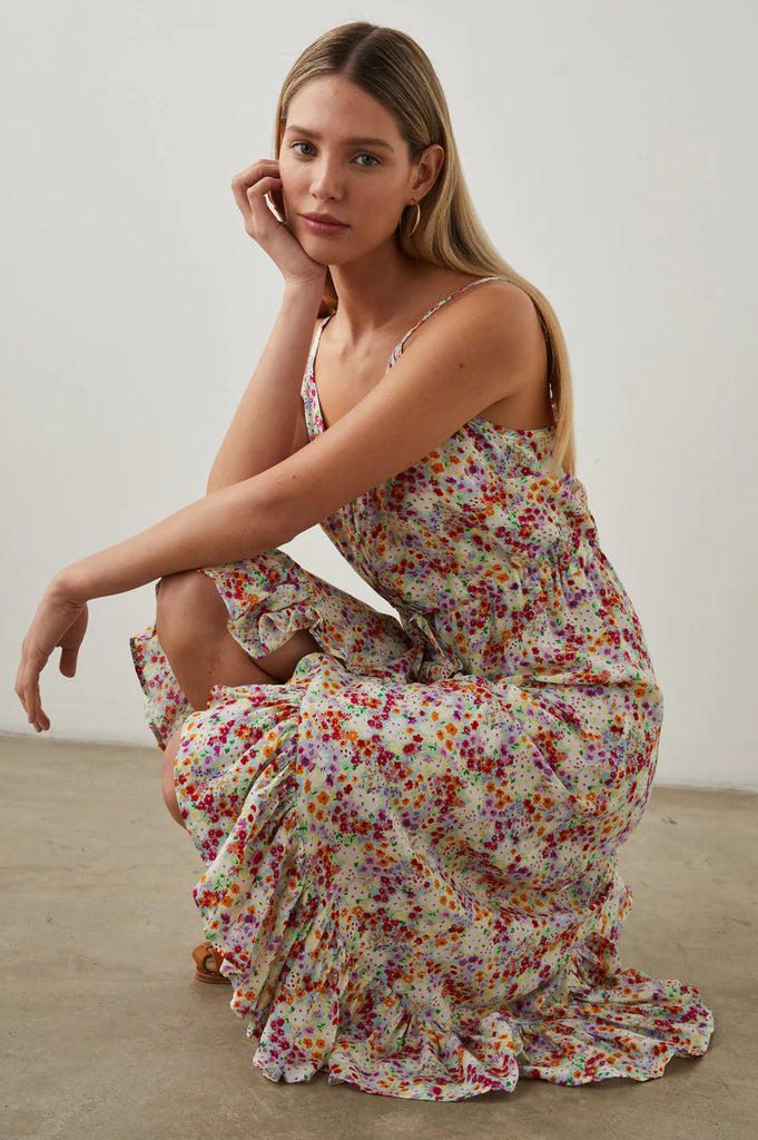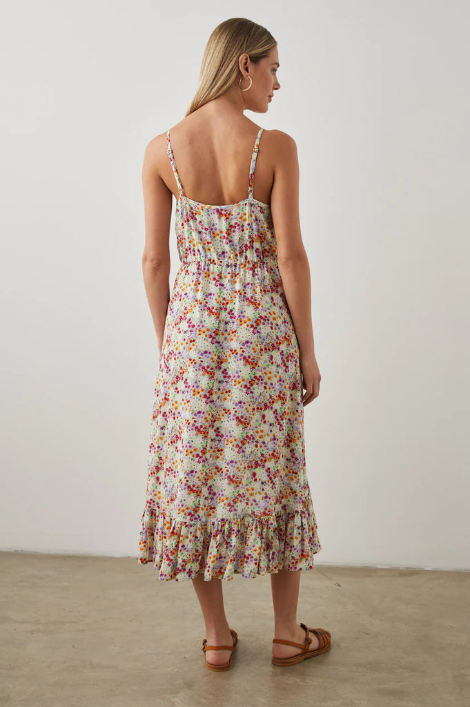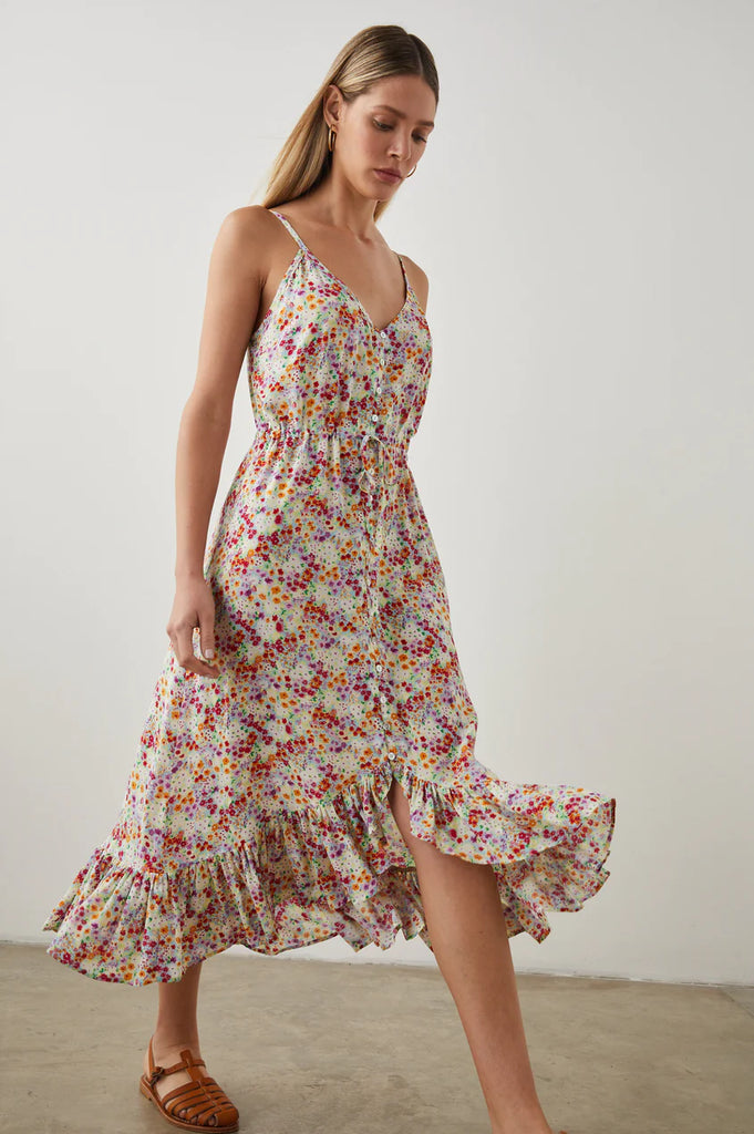 The Frida Dress from Rails is a sleeveless midi in a pretty multi-coloured floral print. It features thin adjustable shoulder straps, fabric covered buttons down the centre, a drawstring waist and a high-low ruffle hem. Feminine and flowy, this style is the perfect day dress.