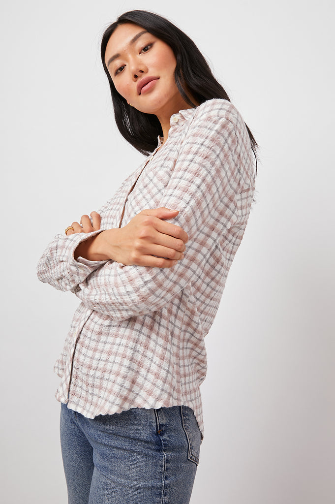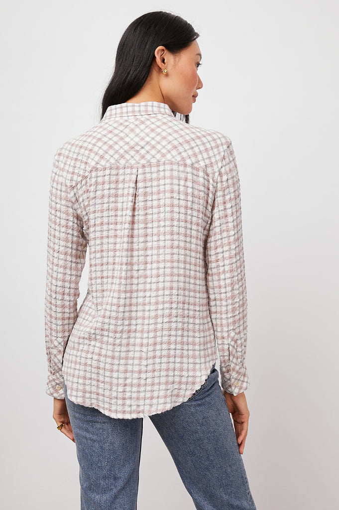 The Brady Top is a lightweight button-down with a unique textured effect in a subtle pink and grey colour-way. This shirt is bound to be your new favourite layering piece. Made from stretch seersucker fabric, this shirt comes in a relaxed fit and has a single patch pocket at chest.