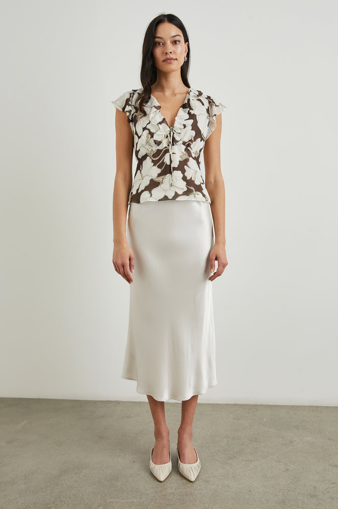 Say hello to Carmine! This flirty and feminine blouse from Rails is crafted from their signature super soft fabric and features a flattering v neck, ruffle details at the neck and a self tie. In a pretty brown and cream floral print this is such a pretty blouse and one you'll reach for again and again. Perfect paired with white denim or the Rails Berlin skirt in ivory.