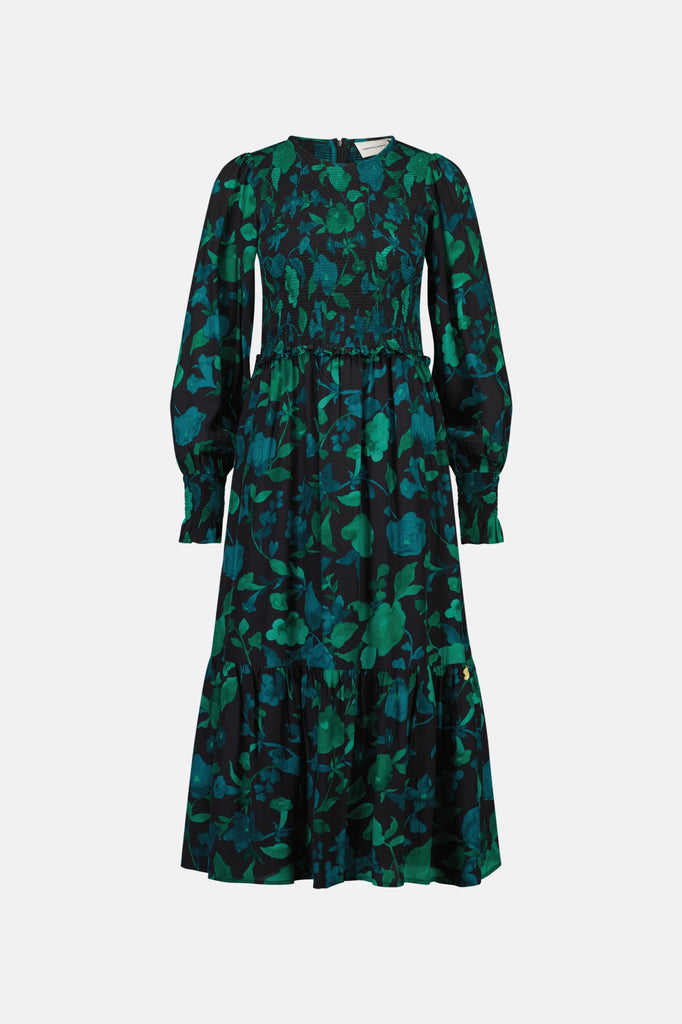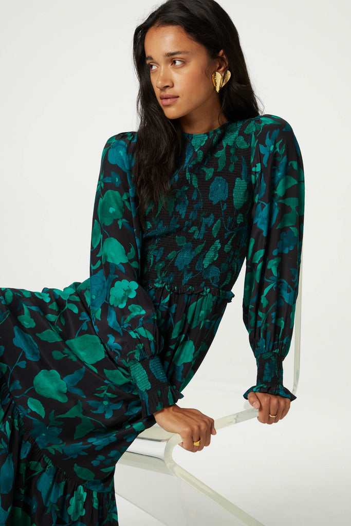 The Caro Dress from Fabienne Chapot features a smocked bust, a crew neckline and long sleeves with elasticated cuffs. This maxi dress has a fully lined skirt and can easily be dressed up or down with boots or heels.