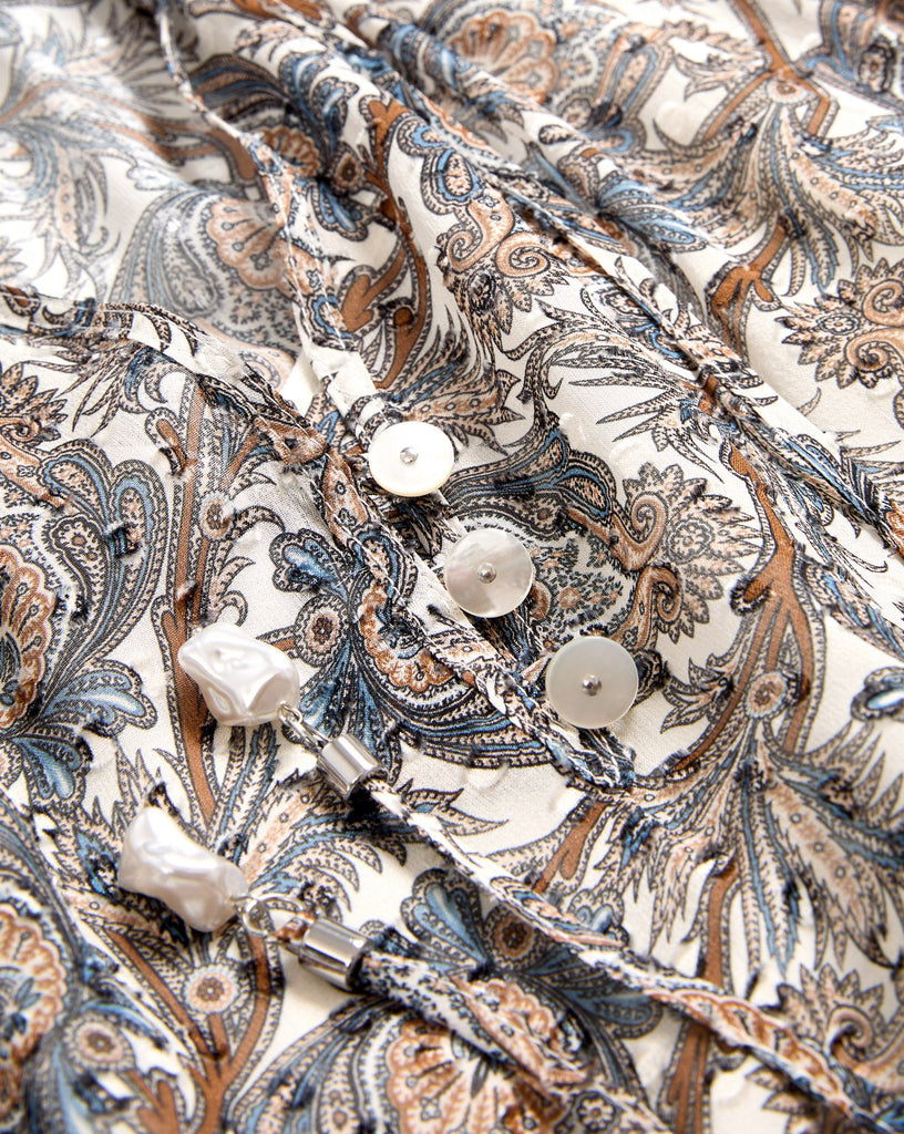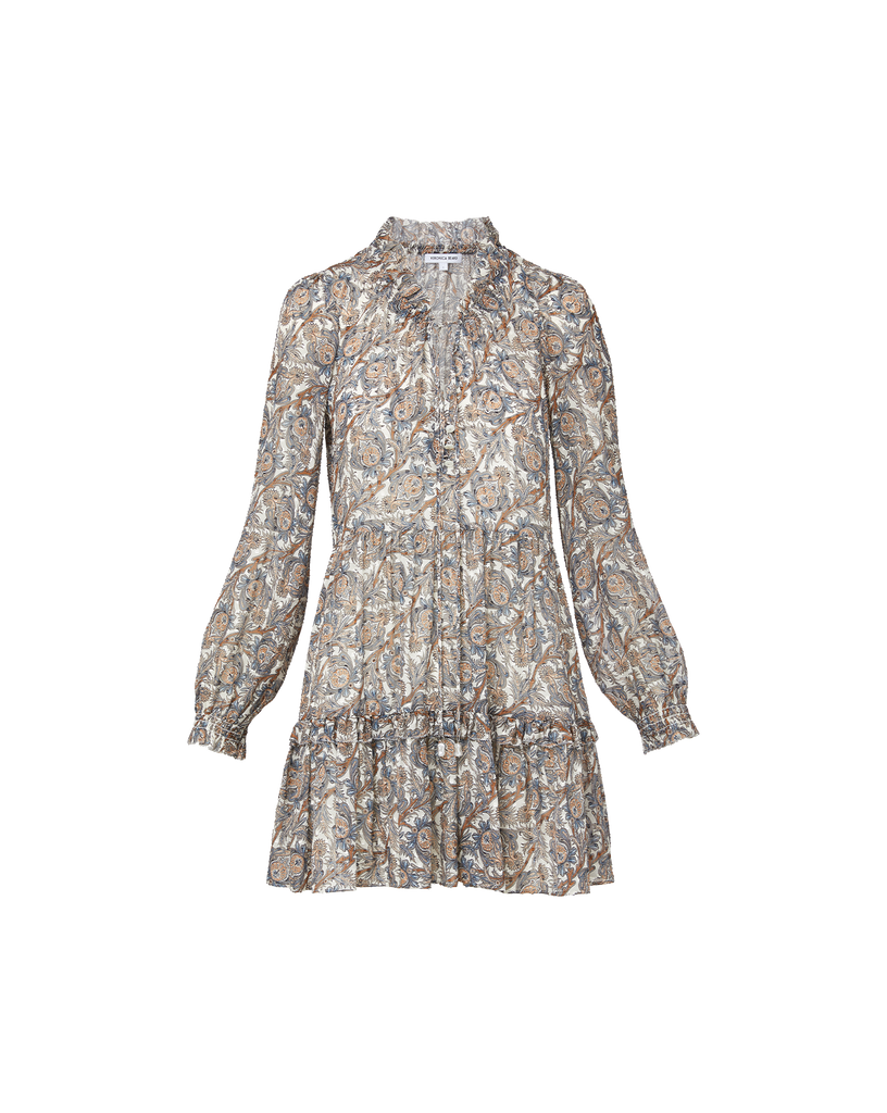What a gorgeous mini dress! Crafted from premium stretch silk in a delicate paisley print and featuring a relaxed fit, gently billowing sleeves, decorative ruffles at the neck and cuffs this is a romantic and feminine dress. Pair with your favourite trainers for an easy one and done weekend look.