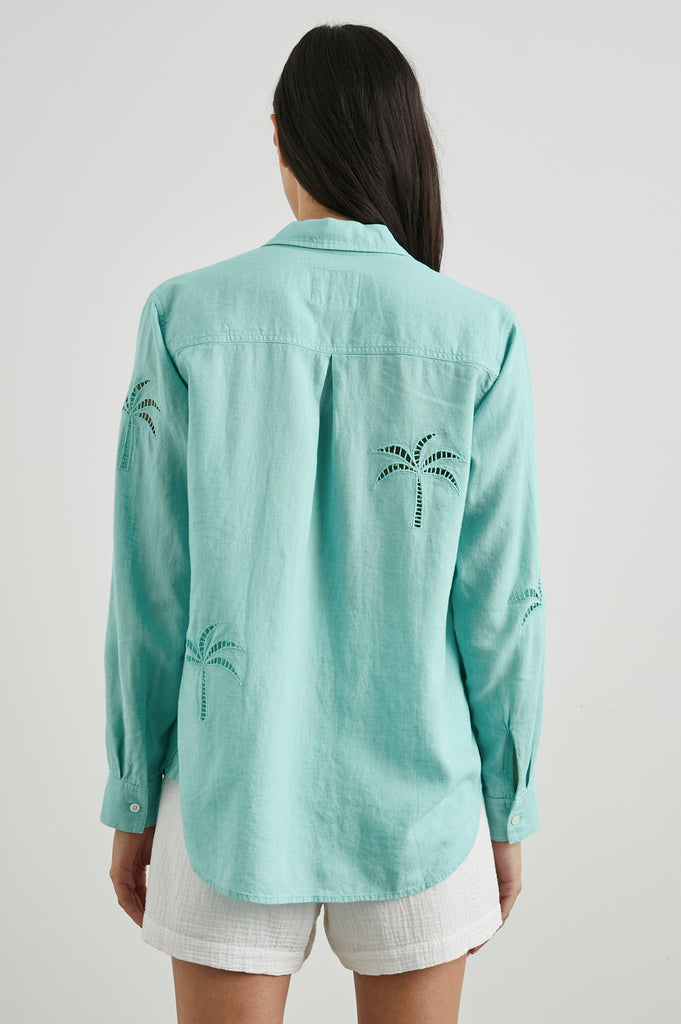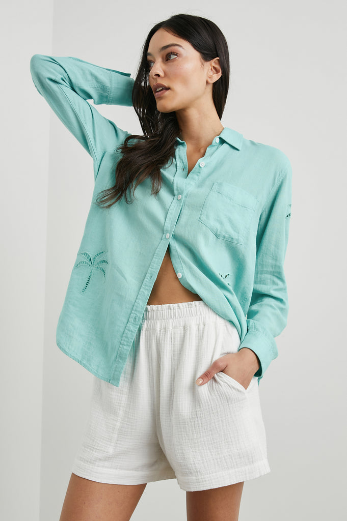 Charli is back in a beautiful aqua colour with a palm tree eyelet detail. A favourite from Rails, the Charli is crafted from a super soft linen and rayon blend. It has a longer hem at the back, a single chest pocket and a relaxed body shape that flatters just about everyone. Pair with your denim for a lazy Sunday afternoon.