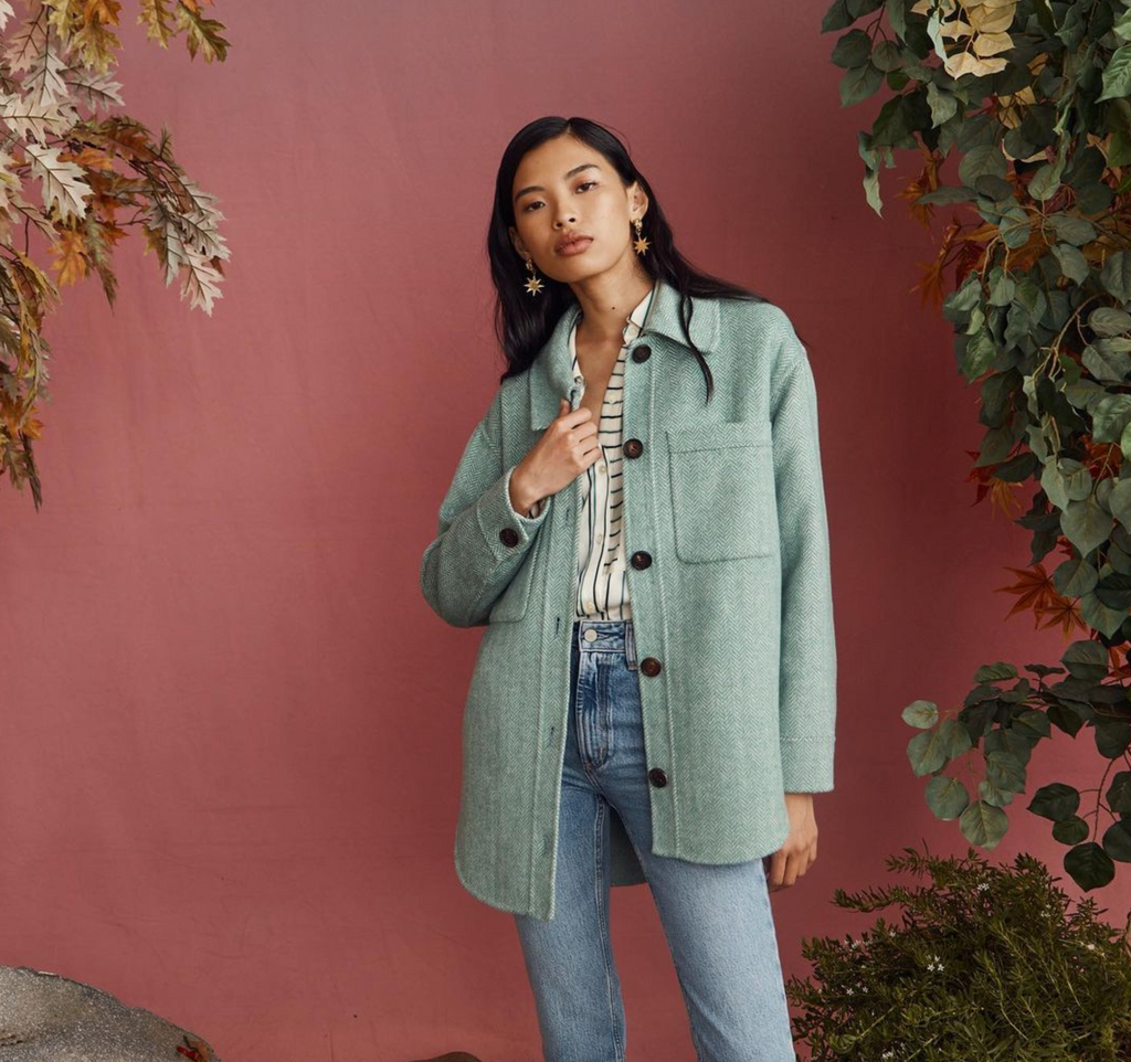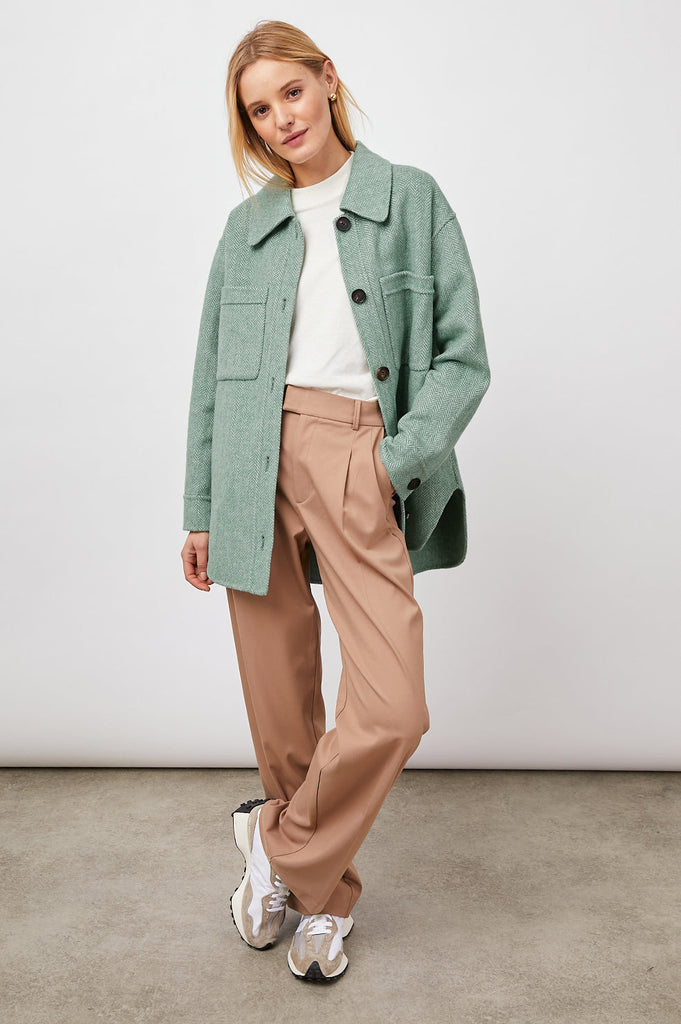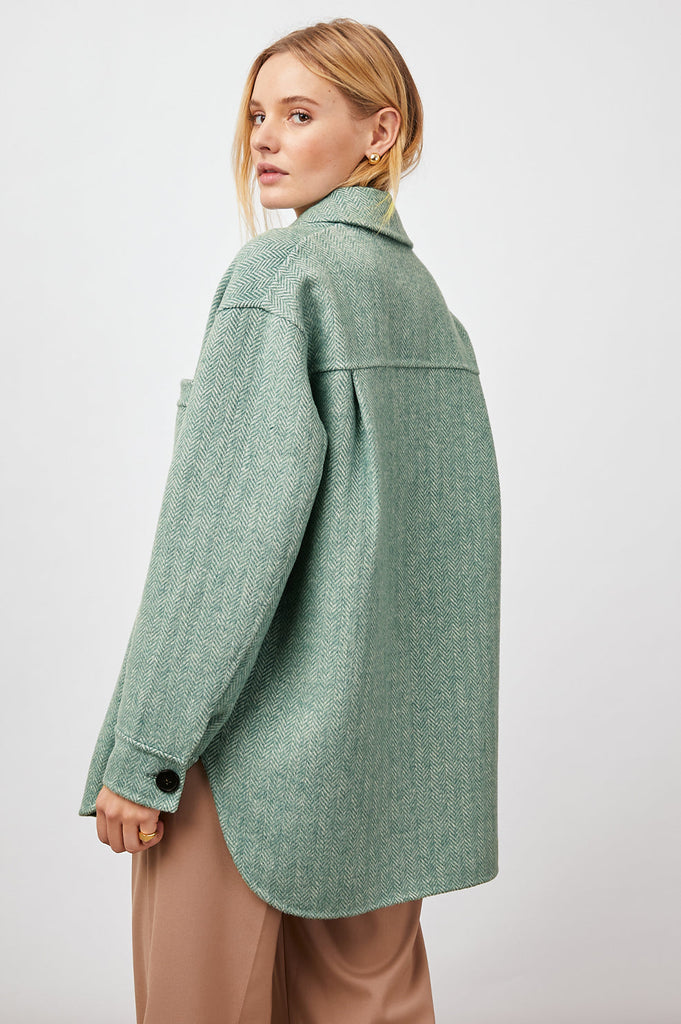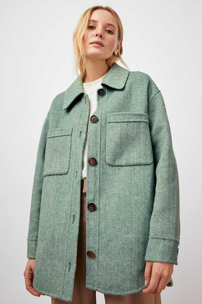 This Connie Shacket is crafted from a perfect wool blend and comes in a feminine light green herringbone. The oversized fit, dropped shoulders and side-slits at the hem create a relaxed but stylish look. This heavy-duty, super cozy shacket is enough to elevate any outfit.