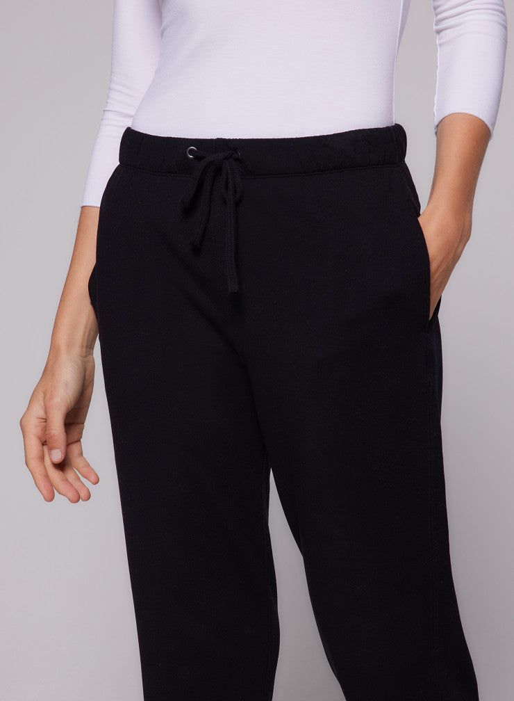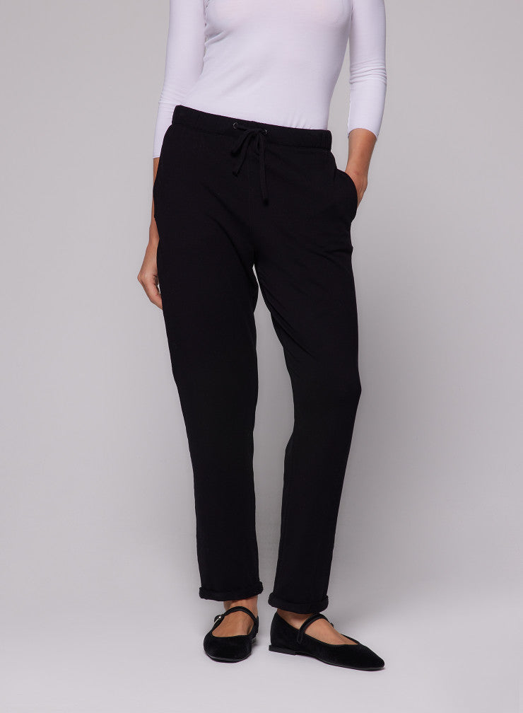 These black trousers from French brand Majestic Filatures are crafted from 96% Viscose and 4% Elastane, giving softness, movement and comfort. They are a tapered cut with cuffs and feature an elastic waistband with a drawstring. Pair with the matching Diane Jacket for a put-together look.