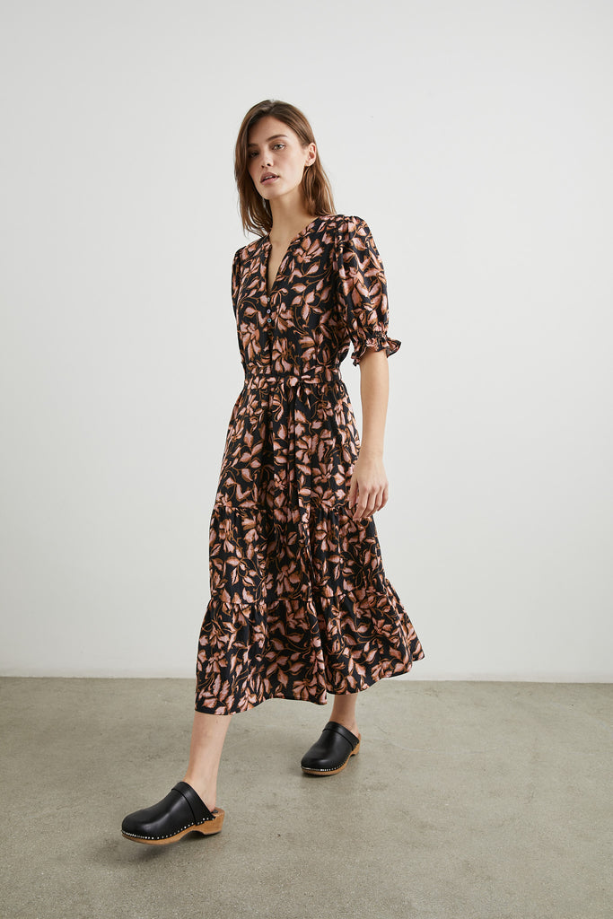 This pretty one and done pullover dress from Rails features a tiered skirt and feminine details. This easy to wear midi dress features a flattering v-neckline, self tie fabric belt, centre buttons and elasticated sleeves. Pair with trainers or boots for a great transitional dress.