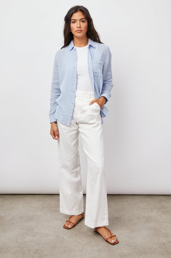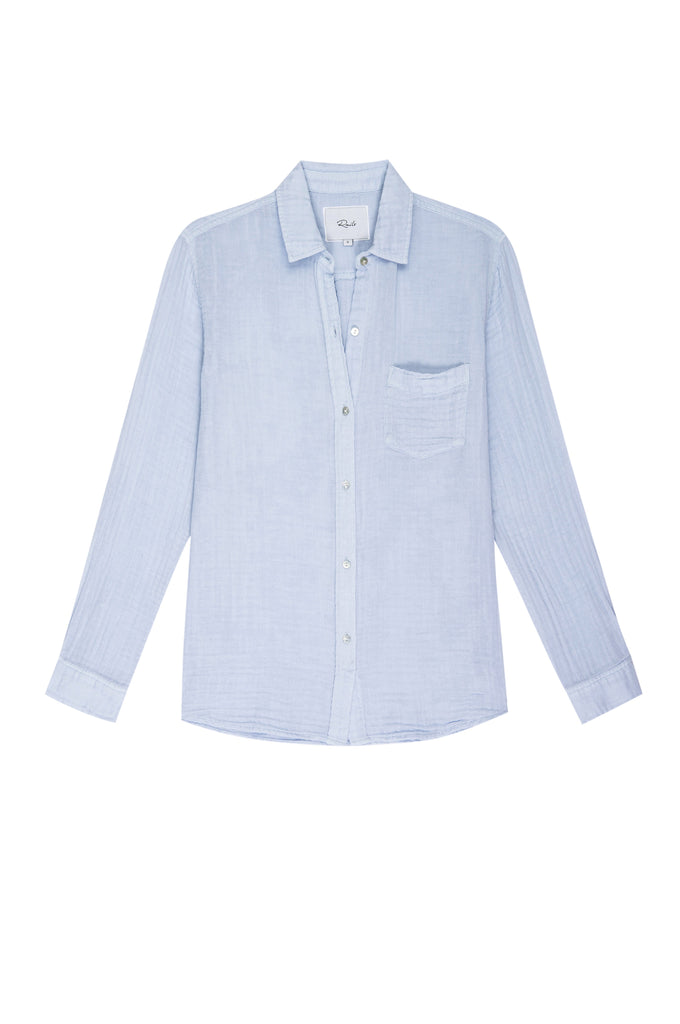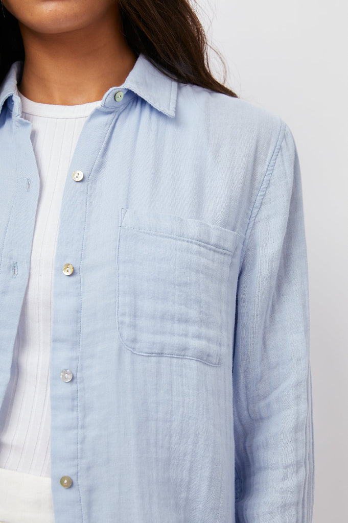 Perhaps the prettiest blue ever! Our favourite super comfy 100% cotton gauze button down shirt is back in a pastel blue. Featuring a classic feminine fit, patch pocket at the chest and a longer back hem this looks great paired with Paige Amber in white. Ellis definitely deserves a place in your wardrobe and we would suggest you get them in every colour!