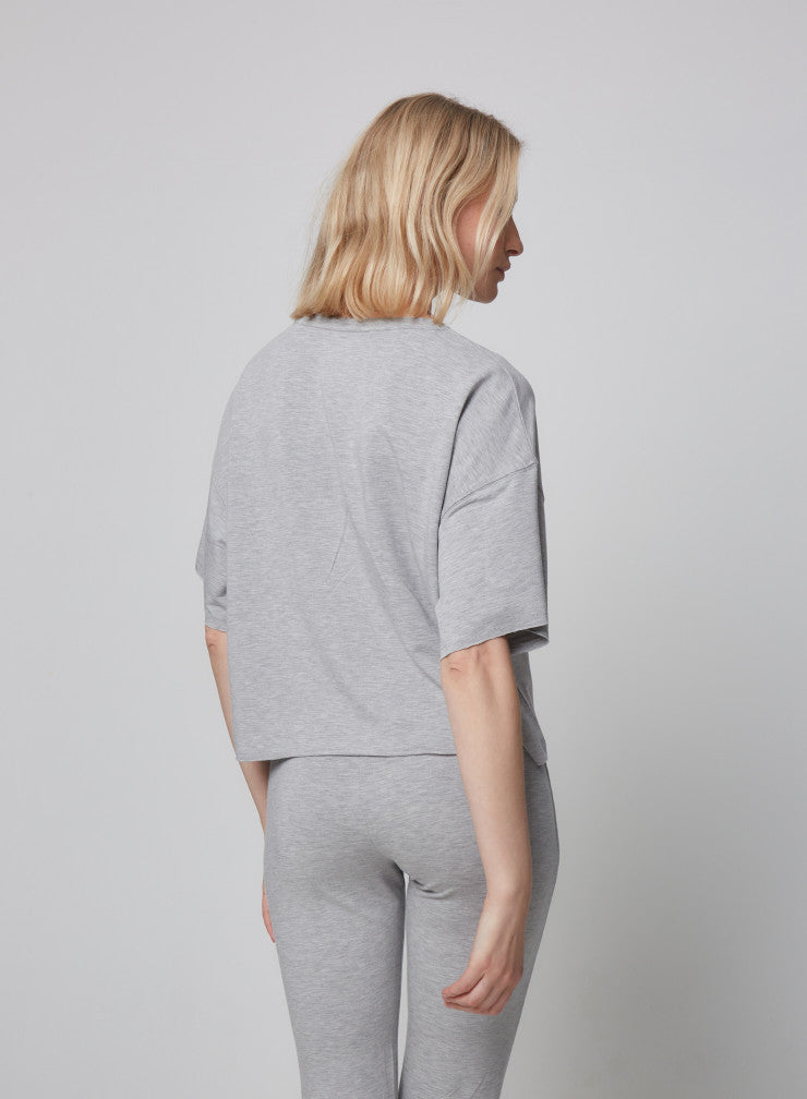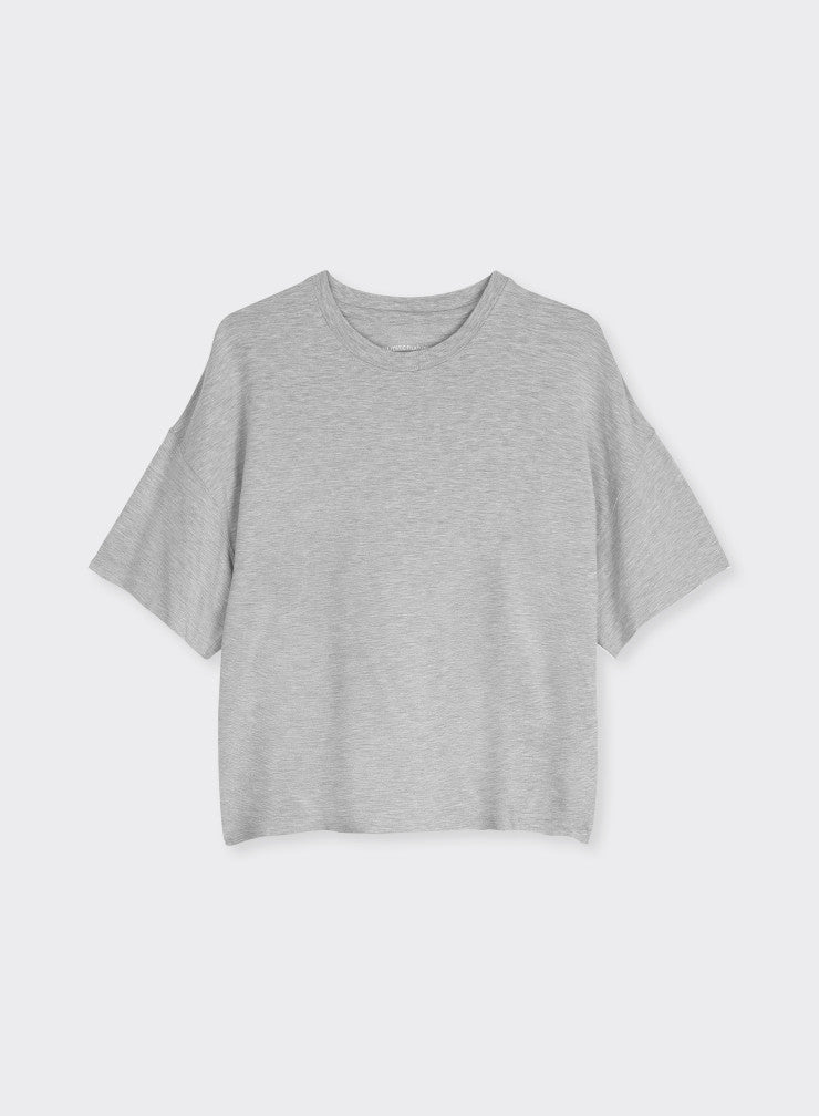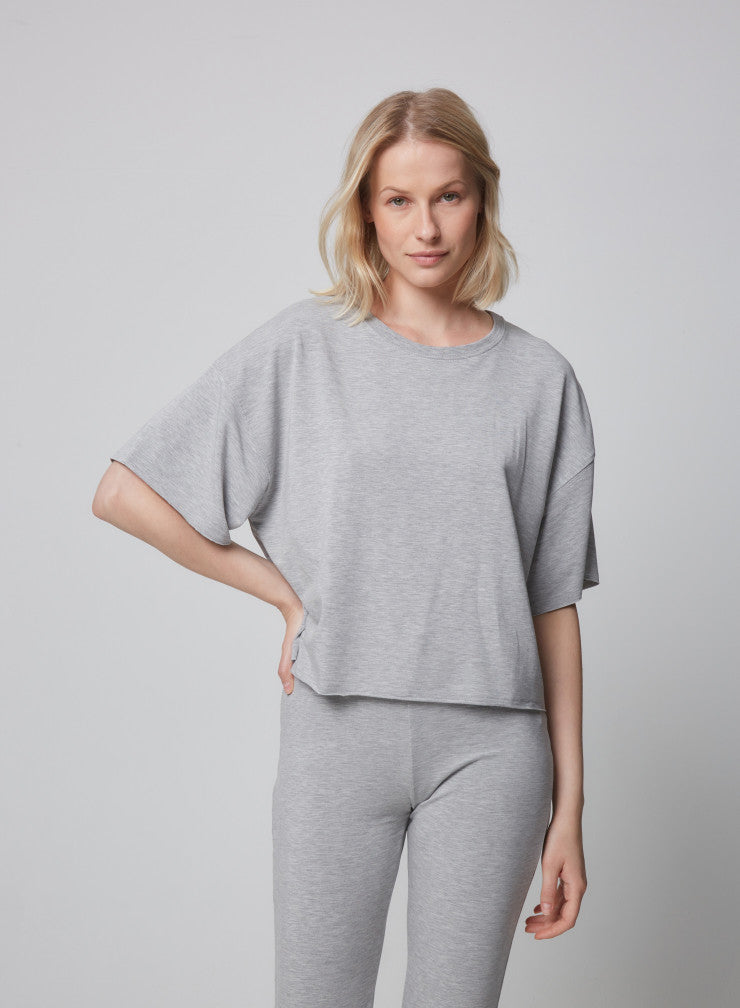 This light grey t-shirt from Majestic Filatures is crafted in Viscose with a slight touch of Elastane adding comfort and softness. Featuring short sleeves with dropped shoulders, free edge finishings and an oversized boxy cut, this light weight tee can be worn with high waisted jeans or the matching wide leg bottoms.
