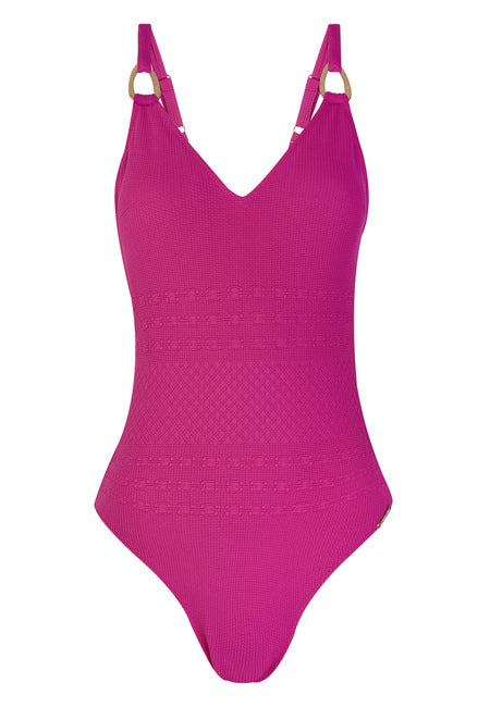 With a low cut back and deep v neck this swimsuit is super flattering. The buckle detail on the straps elevate the swimsuit, and the perfectly placed subtle embossed pattern ensures the most elegant fit.
