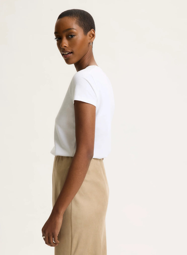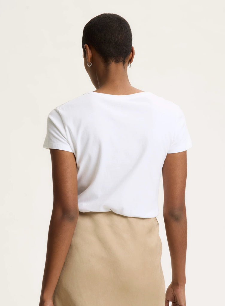 The Jamie white T-shirt from Majestic Filatures is a must-have for every woman's wardrobe. Crafted from 100% Organic Cotton, it features a round neck and is a straight cut. Perfect for wearing under knits or jackets or simply on its own with your favourite jeans.