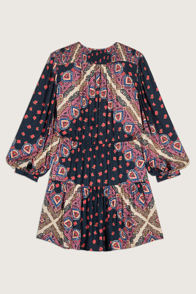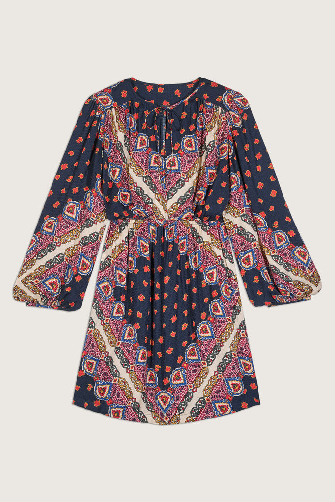 With a nod to boho chic the Jasper Mini Dress features a deep v neck decorated with ties, elasticated waist to highlight your waist, tight wrists and long puff sleeves. In a retro print this is perfect if you want to get your pins out and if not pair with tights and biker boots and a leather jacket for a cool girl vibe!