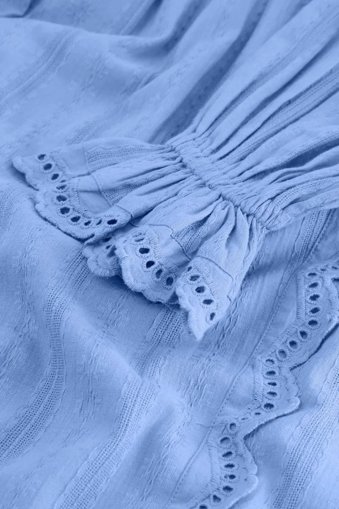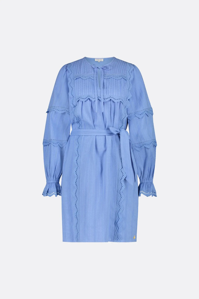 This short blue dress from Fabienne Chapot features long sleeves, a bow belt and a v-neckline with added bow detail. The Jeanine Dress has beautiful openwork details and elastic at the cuffs.