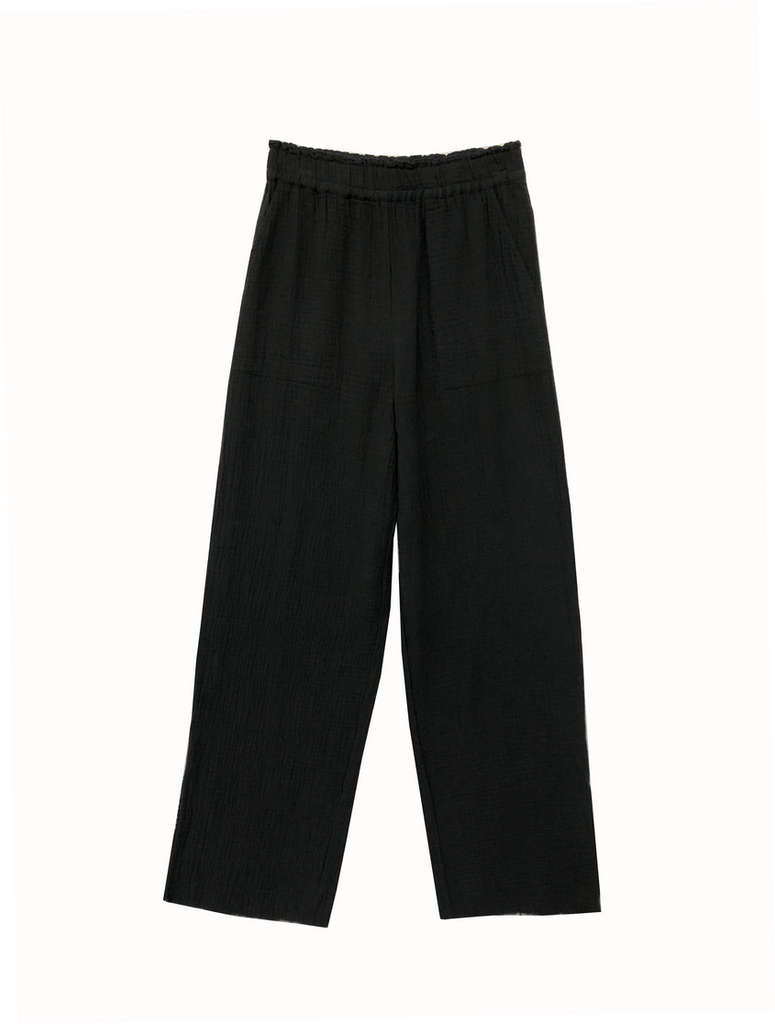 Crafted from Rail's signature super soft, breezy double gauze cotton these pull on trousers in always wearable black are ones you'll wear on repeat. Featuring flattering side slits at the outer leg opening and a smocked waistband these are just the thing for lazy weekends and warmer spring days. A new wardrobe staple!