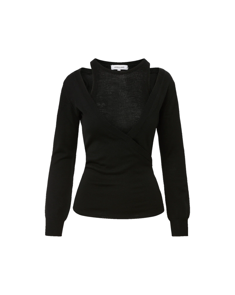 We love an interesting black top and Lolasee is one we absolutely love! Crafted from super soft merino wool and featuring two pieces in one - a v neck jumper layered over a ribbed tank with a subtle yet sexy shoulder revealing detail. The is perfect with your favourite denim for casual cocktails!