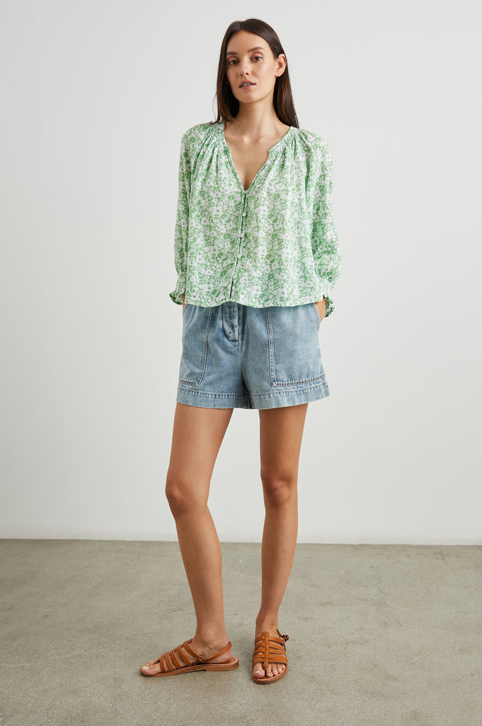 Mariah is an incredibly easy to wear flattering top from Rails. Crafted from Rails signature super soft fabric in a pretty green floral print and featuring a button down front and elasticated wrists this looks perfect paired with your favourite denim or shorts for a laid back easy look.