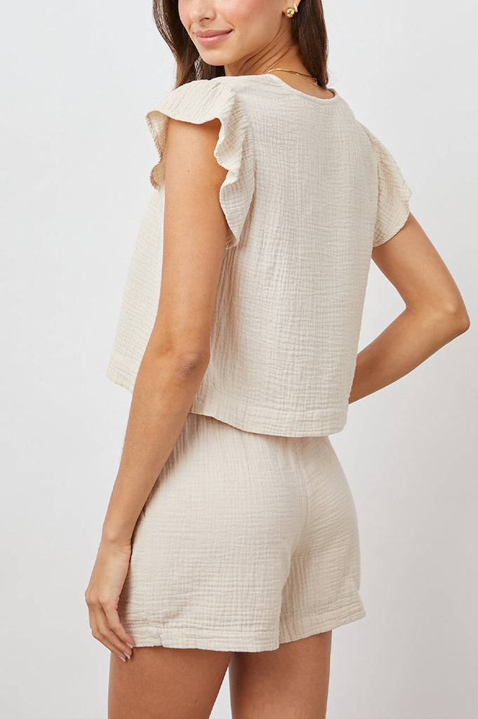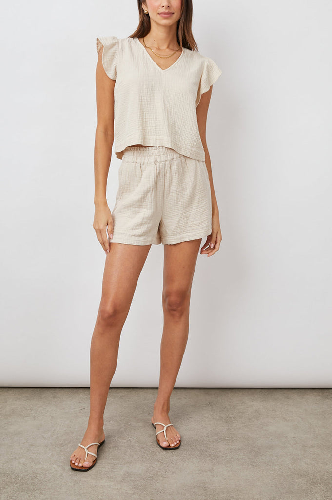 Say hello to Miley. Crafted from Rail's signature 100% cotton gauze fabric and featuring the perfect v neck and lovely little cap sleeves this looks fab paired with your favourite maxi skirts, or when it heats up the matching Leighton Flax Shorts from Rails.
