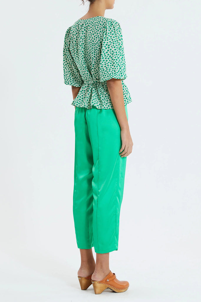 The Petrolina Blouse from Lollys Laundry is a classic wrap around blouse with a v-neckline. This pretty blouse features 3/4 length puff sleeves and a tie around the waist. Pair with white denim for an easy summer look.