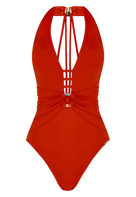 This beautiful one piece from Dolores Cortes has a flattering rouche detail around the tummy and eye catching straps. Super flattering and elegant. Pairs beautifully with the Floral Kaftan.