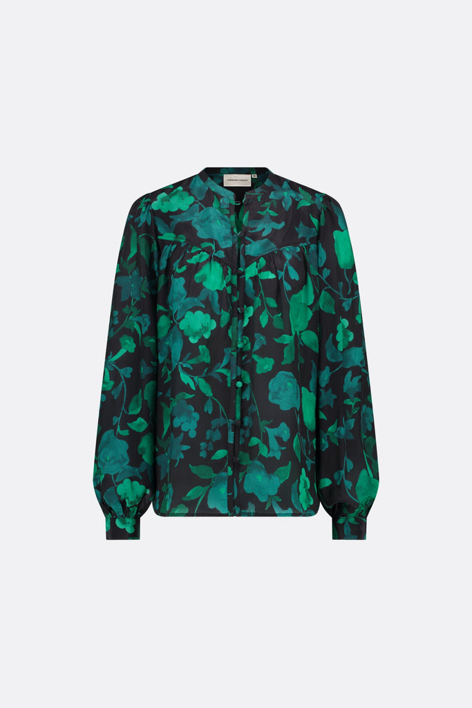The Resa Blouse from Fabienne Chapot features fabric covered buttons down the front and long cuffed sleeves. In a green and turquoise floral print, this blouse looks fab paired with your favourite denim.