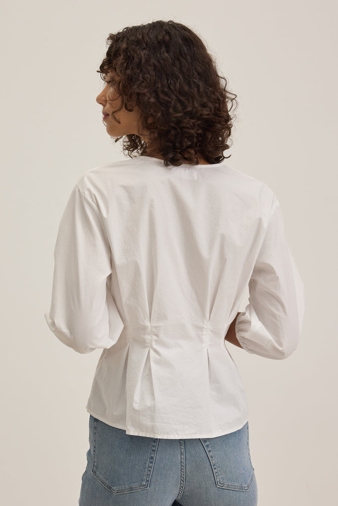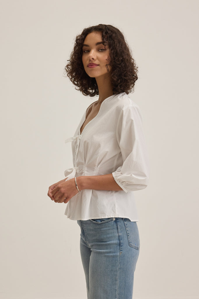 The Riri White Blouse from Velvet by Graham & Spencer is crafted from their signature crisp poplin and will definitely elevate your white shirt collection! Featuring a flattering v neck, gathered 3/4 length sleeves and 2 self tie bows at the centre this is just perfect with your favourite denim.