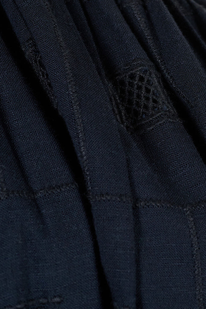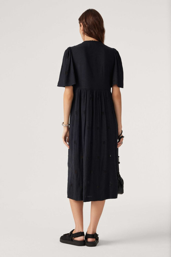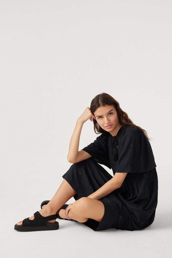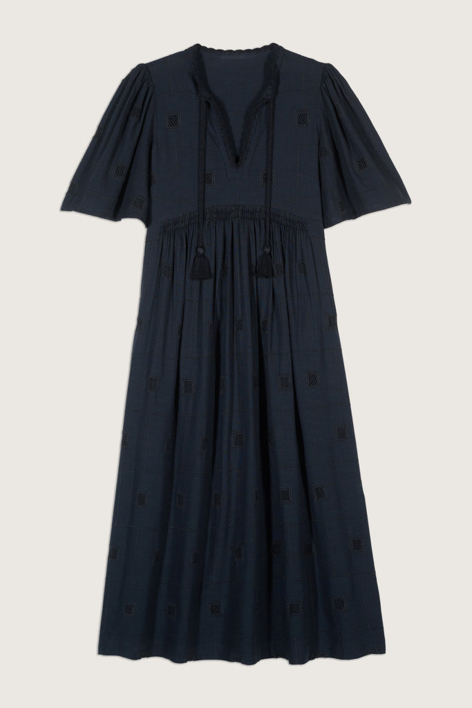 The Romy Dress from Ba&sh features embroidered openwork, an embellished v-neck with pompoms and smocking under the bust. This boho inspired dress is in a light-weight fabric and can be worn with sandals or boots depending on the season.