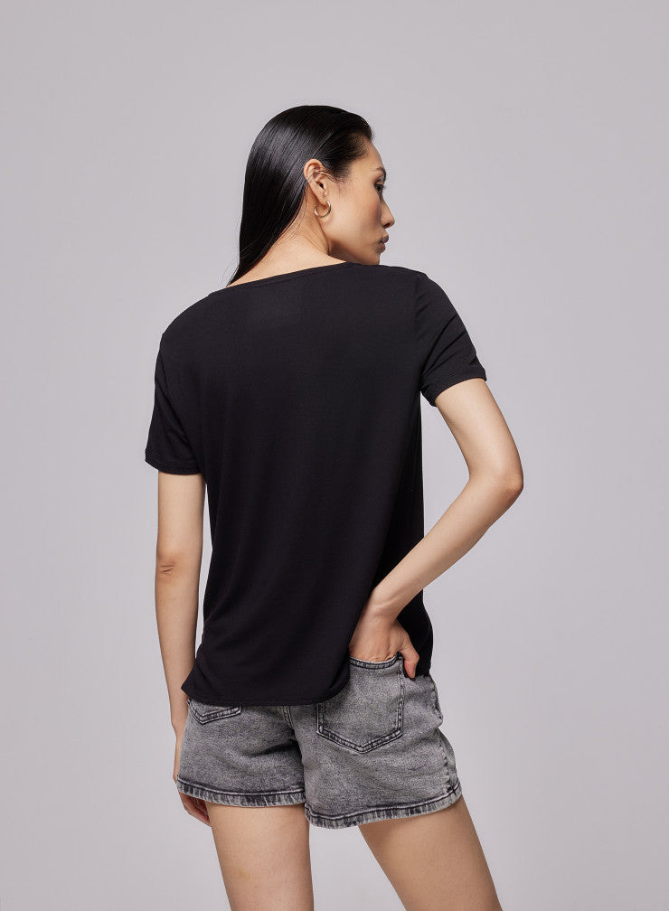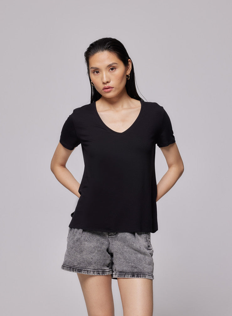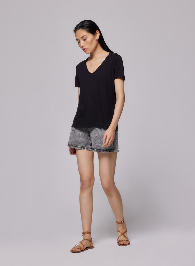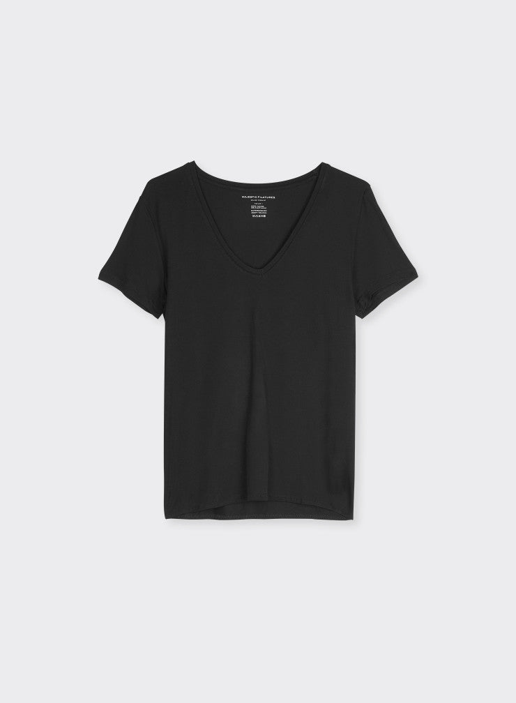 We are delighted to be stocking uber cool French basic brand Majestic Filatures. So very soft to the touch and super comfy this boxy cut v neck is crafted from viscose and elastane and features short sleeves and side slits. Viscose is a natural fabric that comes from a wooden fiber - the addition of elastane brings softness and movement. Perfect oversized with denim for a casual look but also a great option for your work out wardrobe with a legging.