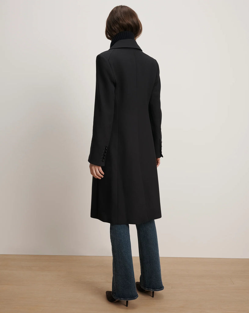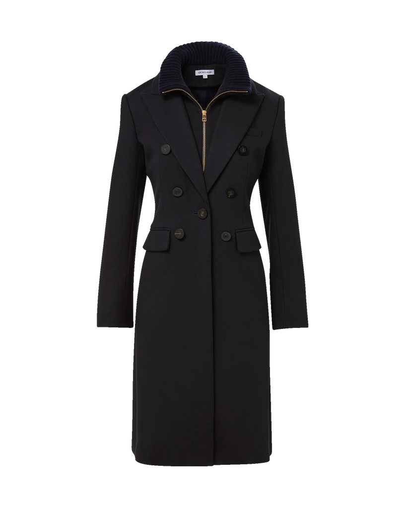 What a coat! The Stryder Double Breasted Dicky Coat in navy is truly a classic sleek piece you will have forever. Crafted from a premium Italian double weave suit fabric and featuring a fitted waist, cutaway hem and subtle A line silhouette which flatters this is one of those coats that smartens up whatever you are wearing. Also the removable extra long dickey with funnel neck and front zip adds a touch of sportiness. A wardrobe classic you will reach for all Winter long.