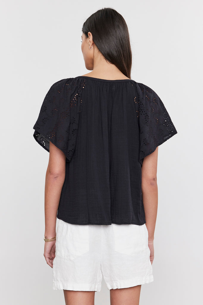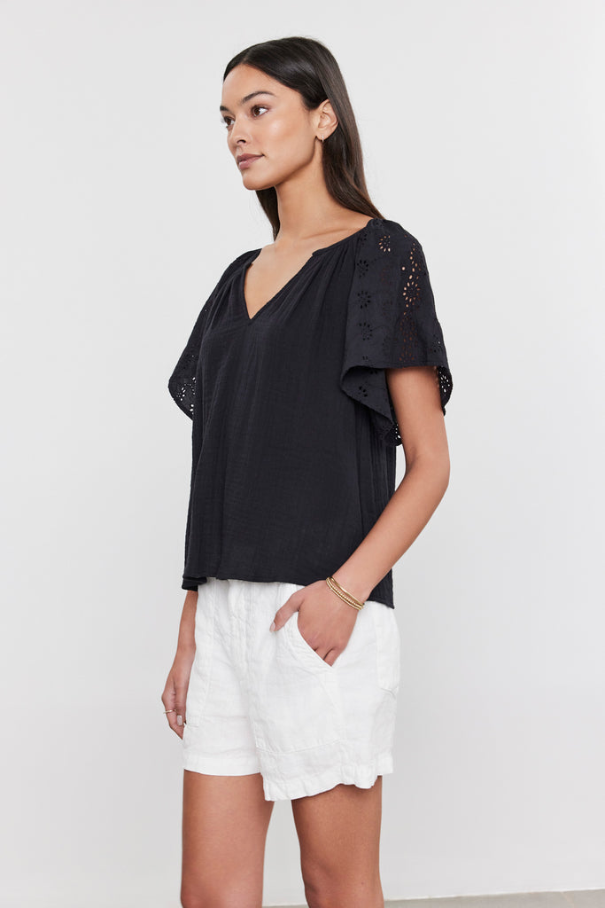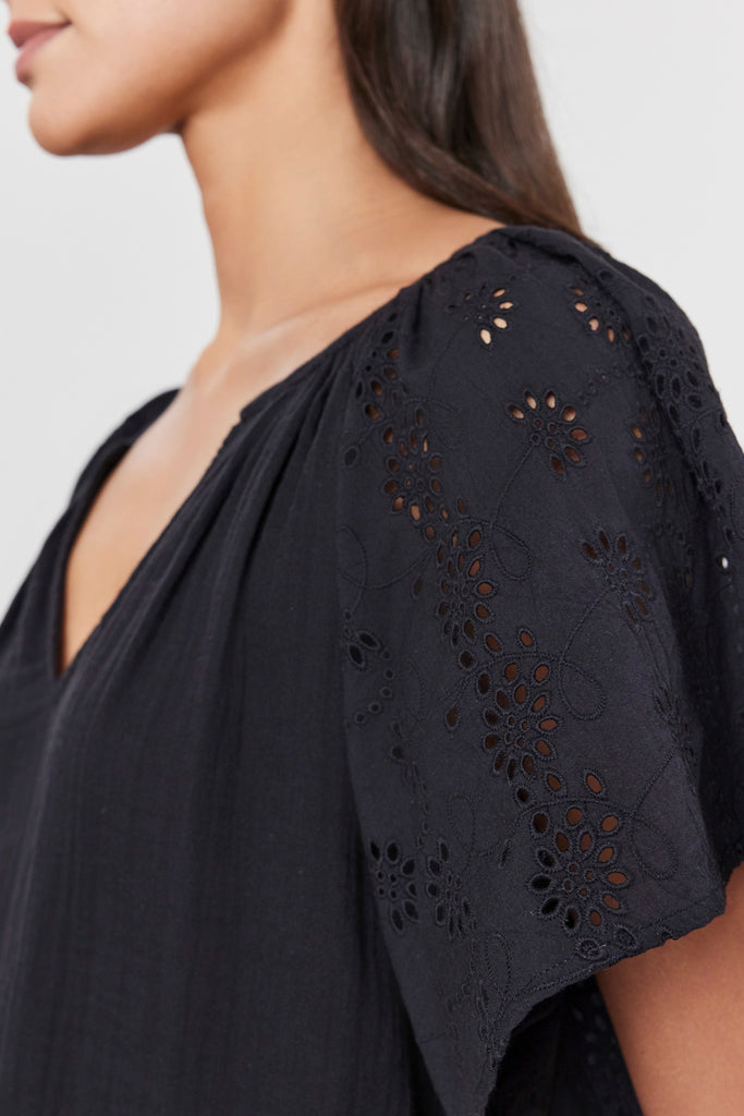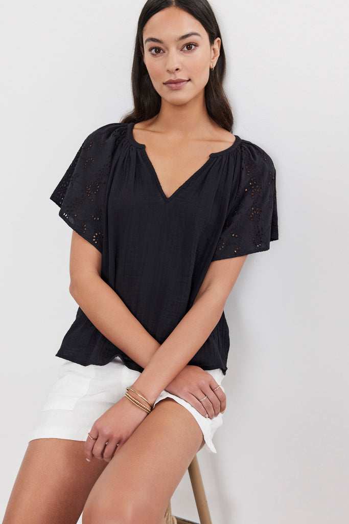 The Tish top from Velvet by Graham & Spencer is crafted from their signature super soft cotton gauze and features embroidered eyelet flutter sleeves and a flattering v neck. Charming and effortless this is perfect paired with your favourite shorts for when the temperatures heat up!