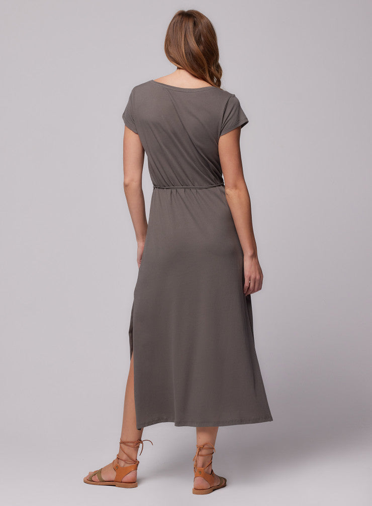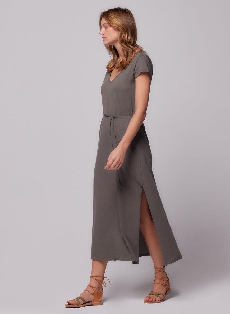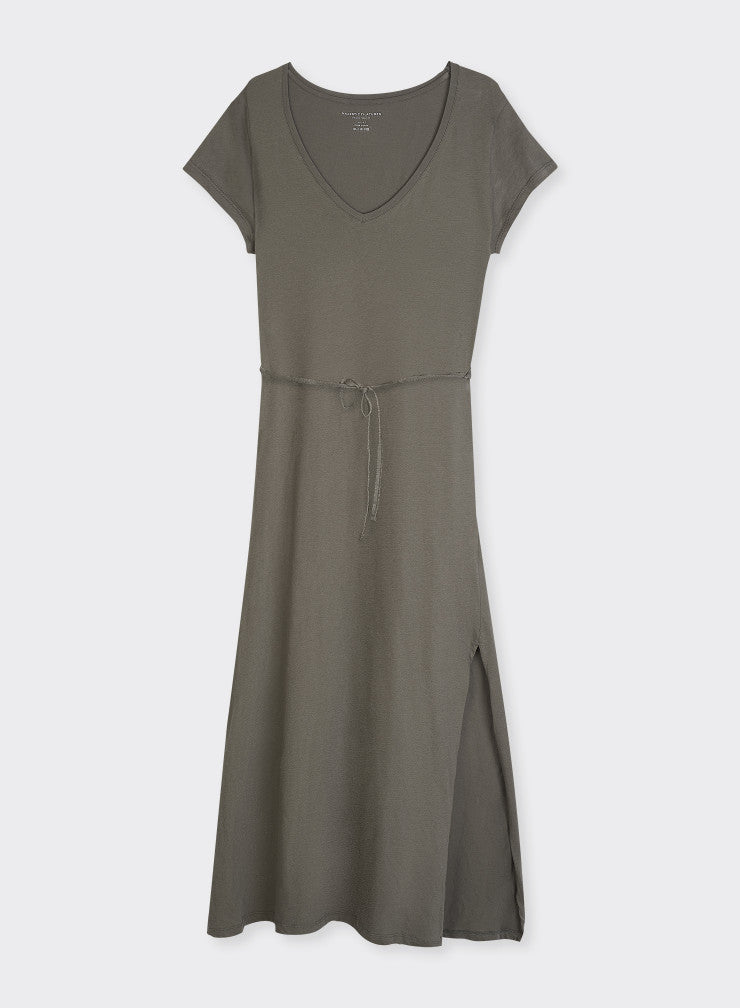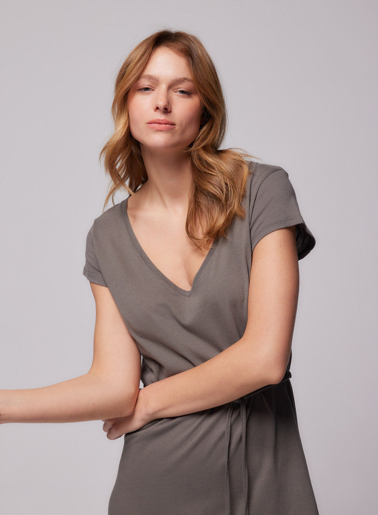 We are delighted to be stocking uber cool French basic brand Majestic Filatures. This elegant dress is crafted from 100% cotton which, as a natural fabric, makes it super soft and comfortable. It features short sleeves, v-neck and side splits and has a matching belt.