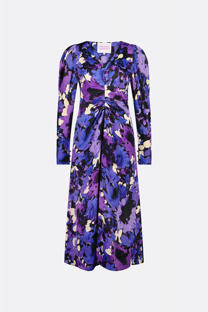 The Vera Dress from Fabienne Chapot features a v-neckline, ruching at the waist and slim long sleeves with button details. This pretty maxi dress in a blue and purple floral print will look fab with strappy heels - great for an occasion!