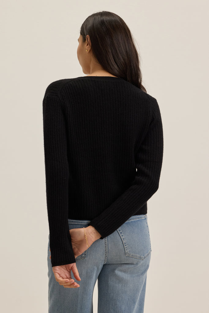 This gorgeous little black cardigan from Velvet by Graham & Spencer will quickly become a go to piece. With a flattering v neck and pretty faux pearl buttons this looks equally good on it's own as it does over a little cami. Perfectly paired with your favourite wide leg denim for an elevated yet relaxed vibe.