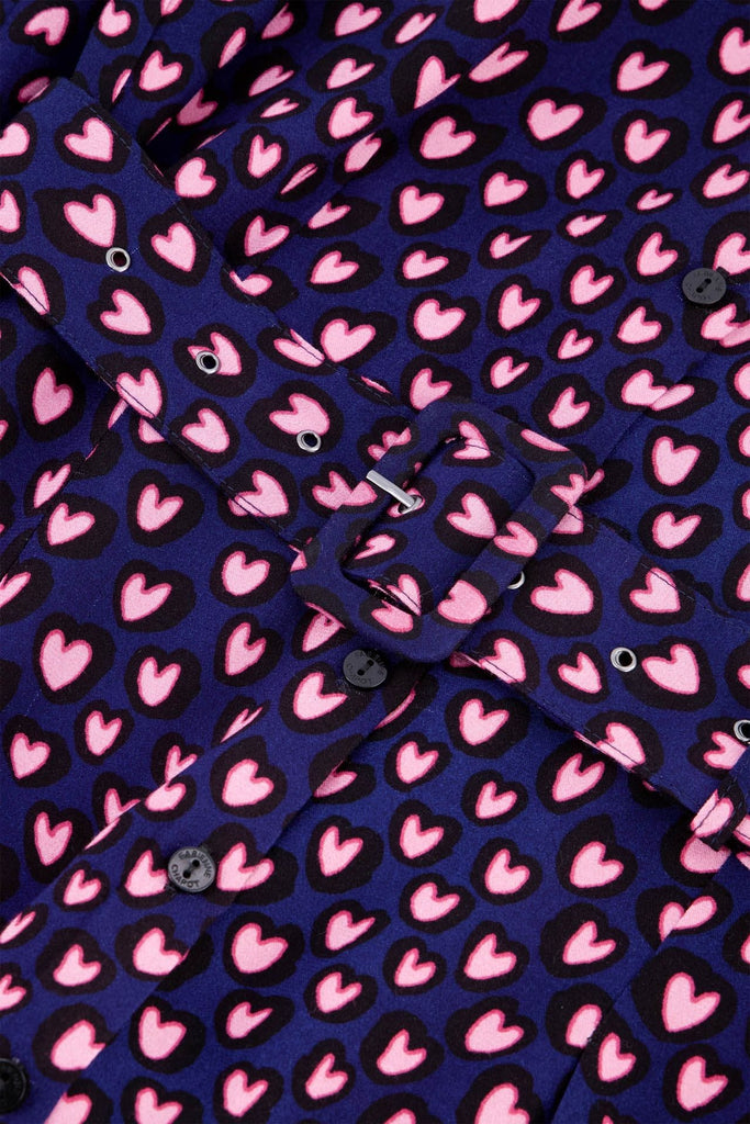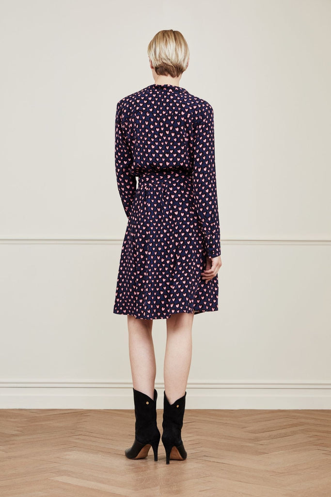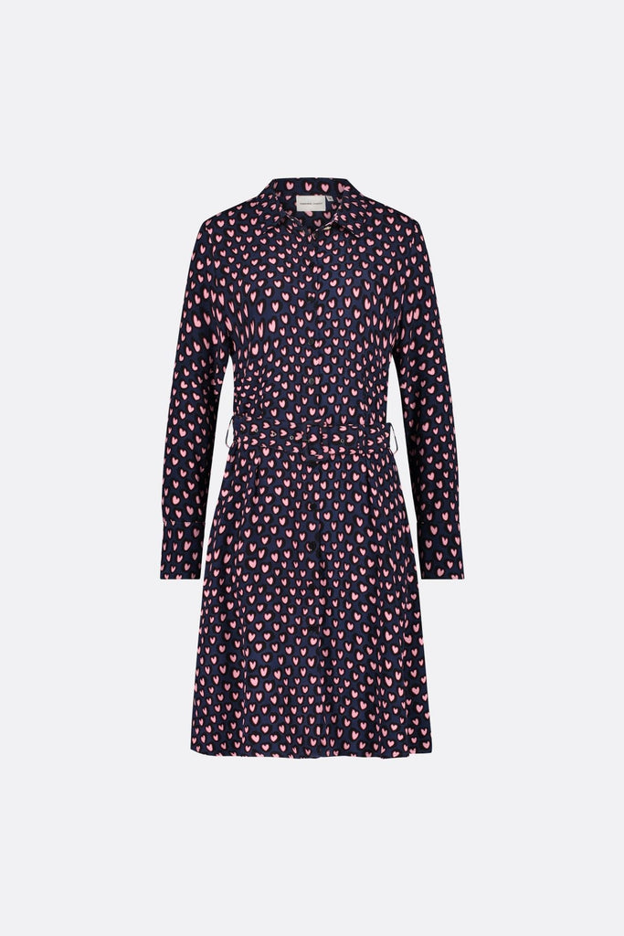 Pretty little shirt dress from Fabienne Chapot. In a feminine navy print with pink hearts this knee length dress has a lovely flirty feel about it. Featuring a buckle fabric tie at the waist and a flouncy hem pair this with your favourite boots and a leather jacket for an evening out.
