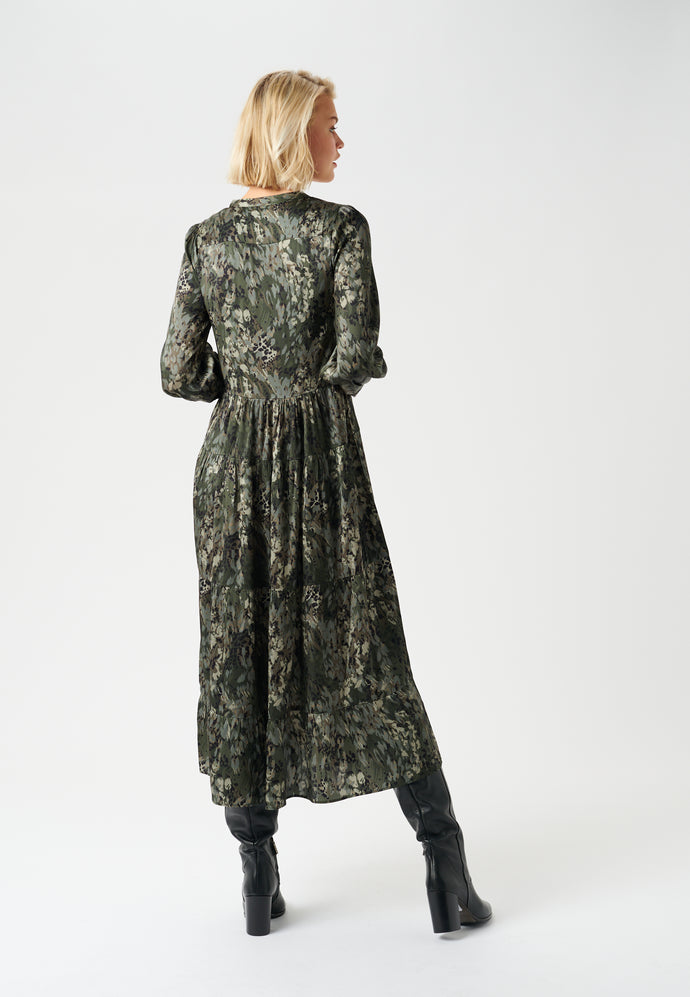 The Seraphina Dress is an absolute stunner from dea kudibal! Crafted from super soft and comfortable stretch silk twill and in a gorgeous grey and green print this is a dress that has it all. Featuring a teardrop opening at the neckline, full sleeves, flattering pleating at the back and nipping in slightly at the waist to a perfect midi length as soon as you put this on you are going to love how it falls. Pair with your favourite boots and leather jacket for effortless dressing at it's best.