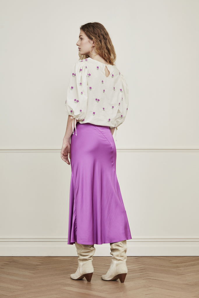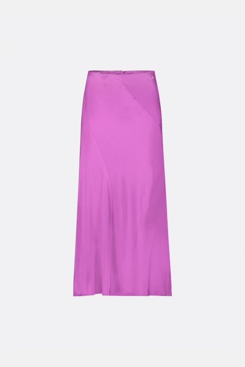 The Suzy Midi Skirt from Fabienne Chapot is crafted in a beautiful purple satin. Featuring diagonal seems, an inner-lining and a dainty heart detail, this bias skirt is perfect for any occasion. Dress up with a blouse and heels or dress down with a t-shirt and trainers.