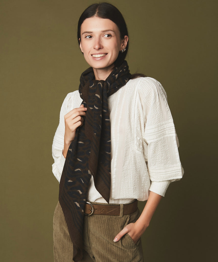 This is a super easy to wear 100% wool scarf from Hartford. In a leopard print with a nod to army print this scarf measures 120cm by 120cm. Pair with your neutral knitwear to add a bit of style!