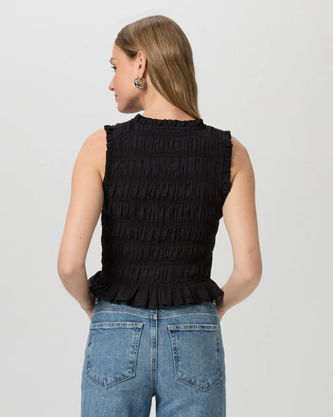 The Devi Top from Paige is crafted from a super soft lightweight cotton/rayon blend and features a sleeveless fitted silhouette, a flattering v neck line, smocking throughout, a tie front and ruffle details. Perfect paired with your favourite denim.