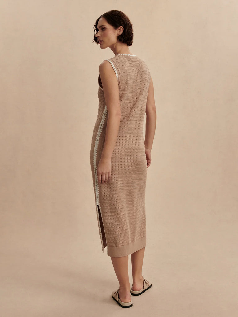 Be on trend with this chic sleeveless knit dress from Varley. Crafted from 100% cotton pointelle knit, it features contrasting white scalloped edging around the neckline, sleeves and side splits. Pairs equally well with trainers, sandals and loafers.