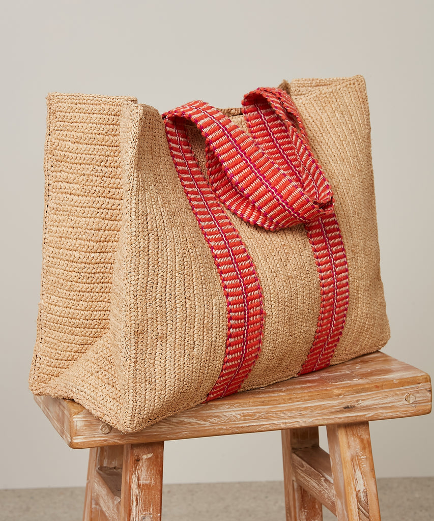 This woven raffia bag from Hartford features cotton pink and orange handles and is perfect for the beach. Fit all your essentials and more into this spacious shoulder bag. Wear with an easy summer cover-up and Castaner sliders for the ultimate summer feel.