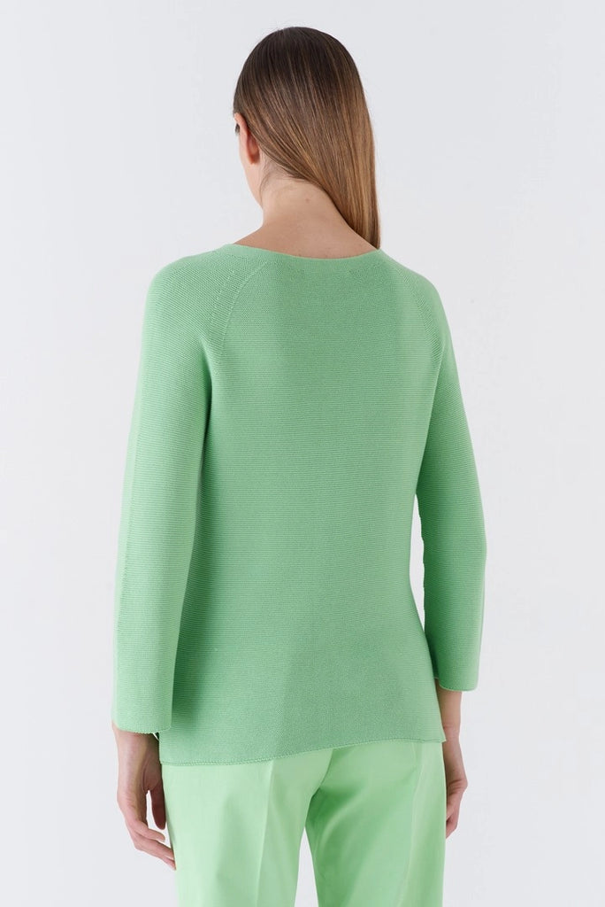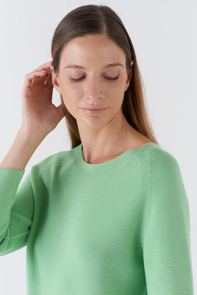The Monello Jumper from Amina Rubinacci is crafted from 100% cotton. In a vibrant green this fine cotton knit is a perfect transitional piece and looks fab paired with white jeans. Featuring a wide crew neckline, wrist length sleeves and subtle slits at the sides, this jumper is easy to wear all day everyday.