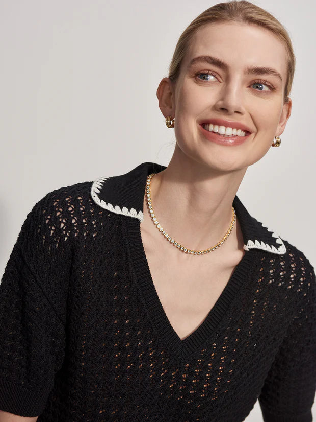 The Monte V Neck Knit Polo from Varley is crafted from 100% cotton and features a pointelle stitch. It has an open collar with contrasting white stitching and elbow length sleeves. Pair with the Slim Cuff Pants for an effortless look.