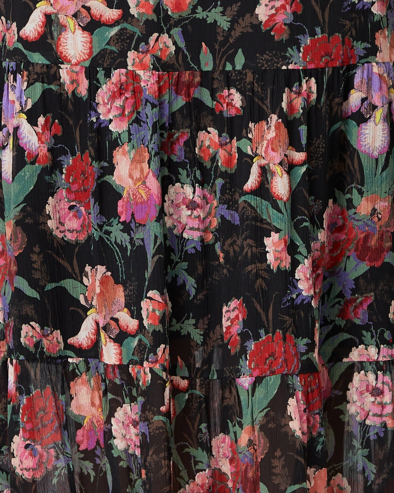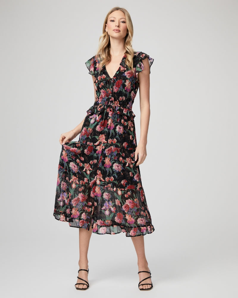 The Paradis Dress from Paige is the must-have floral dress of the season. Crafted from luxurious silk georgette with a crinkle texture, this gorgeous midi dress has a ruffle detail at the cap sleeve opening, covered buttons down the centre front, a flattering smocked waist with an adjustable waist tunnel, a tiered skirt with ruffle detailing and a flirty front slit.