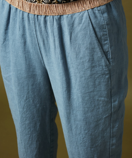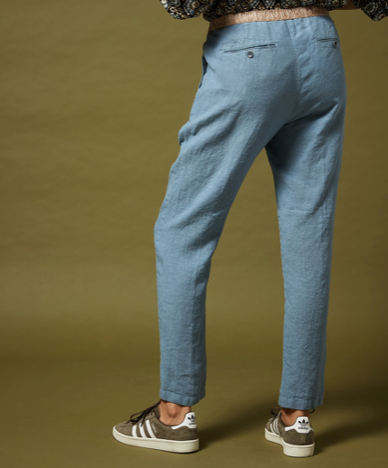 Thank you Hartford for creating a super comfy elasticated waisted linen trouser that still looks elegant. Featuring a lurex bit of gold at the waist and a slim fit these are the perfect Summer trousers. Pair with a printed shirt or your favourite tee and you are ready to go.
