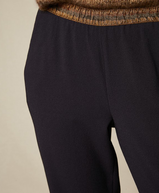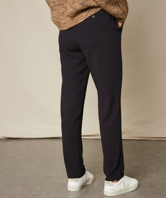 Our favourite shaped trousers from Hartford are back with a nice lurex detail at the waist. With an elasticated waist and crafted from a wearable crepe fabric this is an easy trouser to wear. Universally flattering with a nice slim leg pair this with your favourite jumper and a trainer.