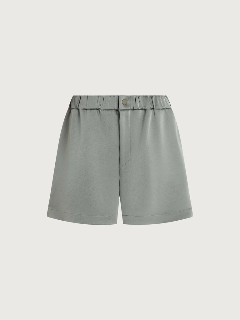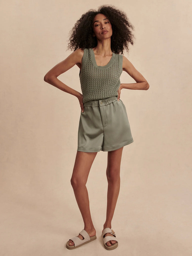 The Sarka shorts from Varley are crafted from a sophisticated sateen fabric. They are a high-rise cut featuring an elasticated, gathered waistband with a snap-fastening and a zip front. They have a loose leg shape with side pockets and mock pockets at the back. Pair with the Ferns Open Knit Tank for a put-together look!