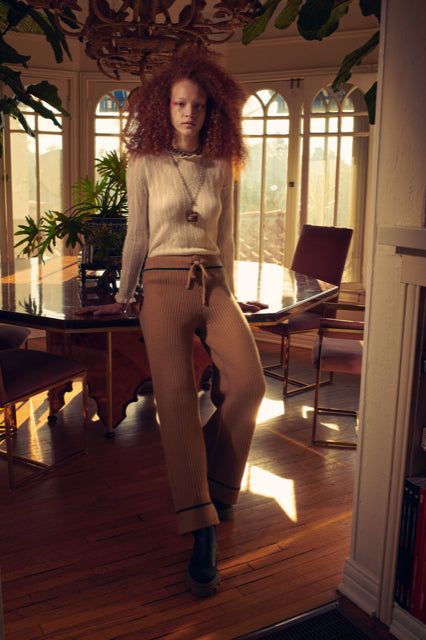 Super cool cashmere & wool blend wide leg trousers from ultra chic cashmere brand Madeleine Thompson. In a gorgeous camel colour with a green stripe detail at the waist and cuff this looks fab paired with a tee and the matching Clover Cardigan for the ultimate in co-ord dressing! Perfect for a cozy night in but equally wearable out and about with a chunky boot or trainer.