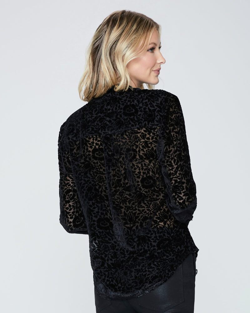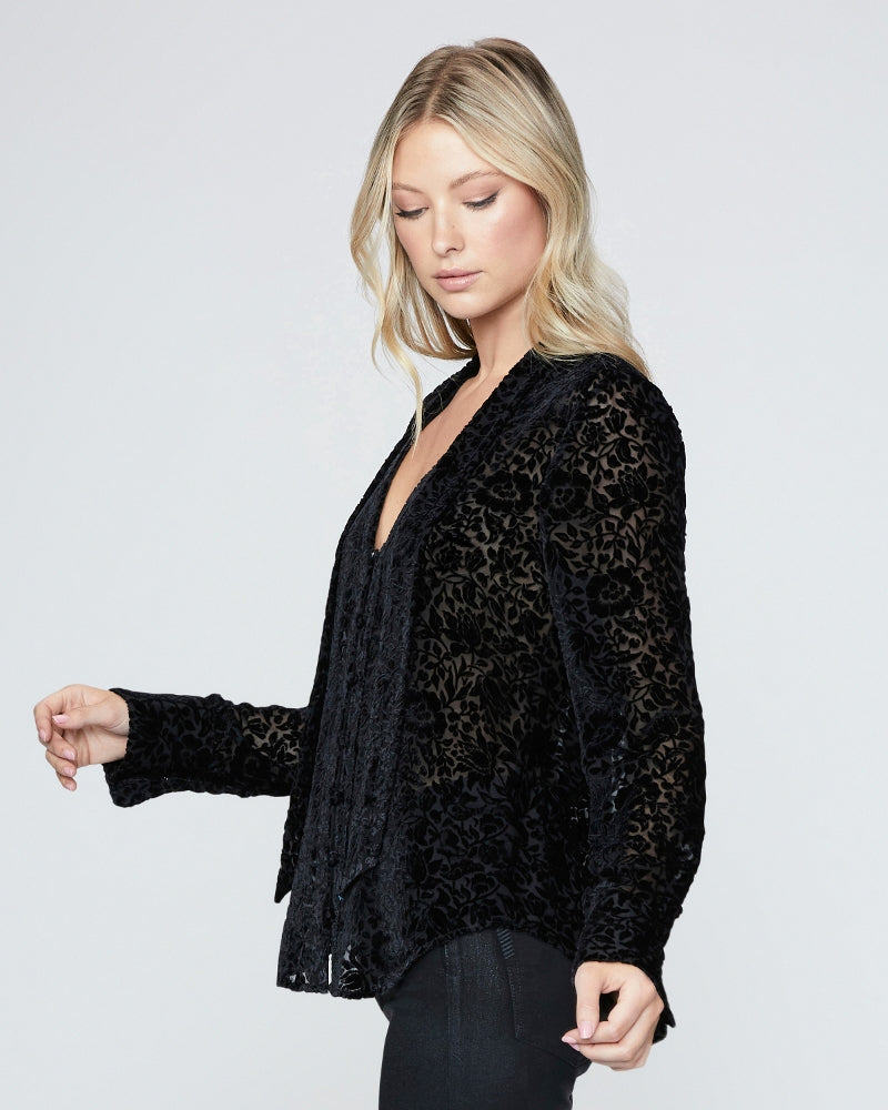 The Yvenna Blouse in black features long sleeves, a flattering v neck, covered buttons down the front, flared cuff sleeves and a tie front detail which can be either bowed or worn loose for an effortless vibe. Looks perfect paired with the Paige Cindy with the luxe coating.
