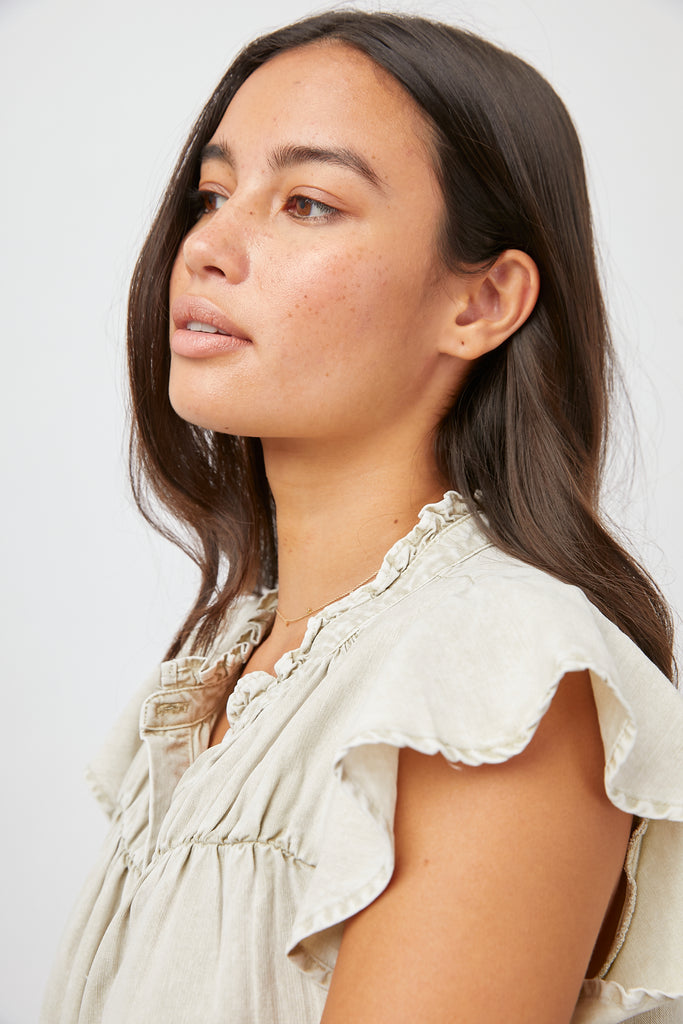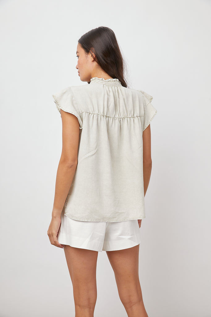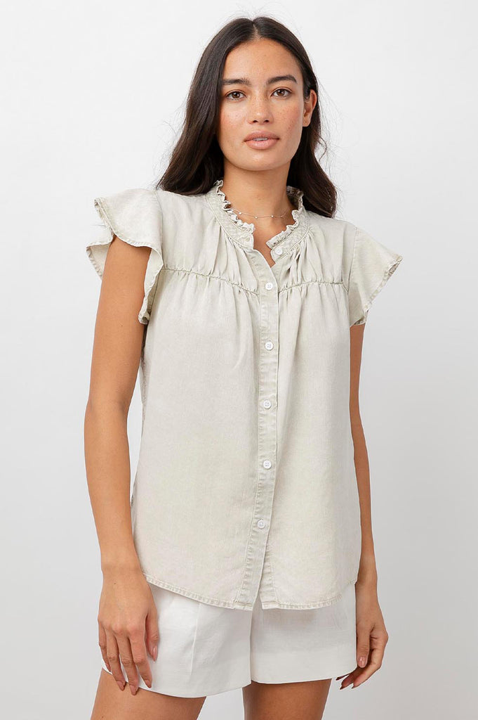 This lightweight, tencel denim, faded sage button down shirt from Rails features an acid wash finish, a banded collar, romantic ruffle detailing at the neckline and cap sleeves with flounce detail. This is a super soft, feminine take on the classic denim shirt.