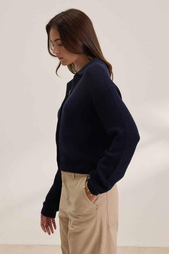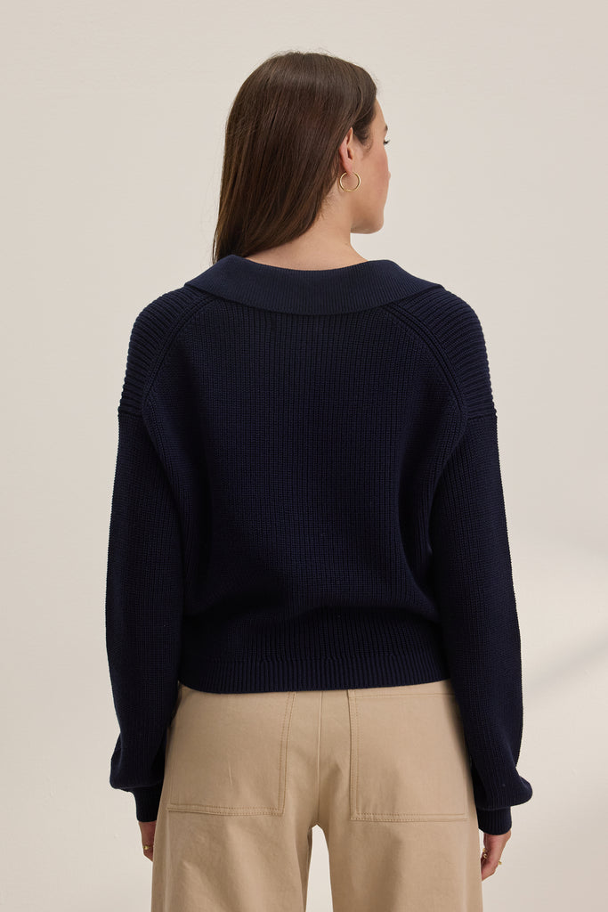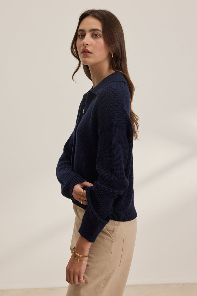 The Taj Cardigan is a super soft cotton knit from Velvet by Graham & Spencer. In an easy to wear navy, this pullover features a preppy/sporty collar and long sleeves. This is perfect paired with your favourite skirt or denim!