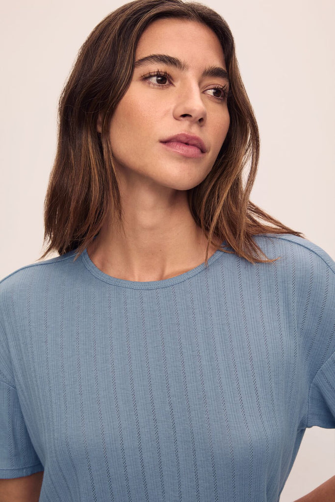 This luxurious loungewear set from Eberjey's latest collection is a classic and you will want to wear it all the time, whether you're sleeping or simply lounging. It is crafted from a blend of Prima Cotton and Tencel Modal, making it extremely soft, comfortable and easy to wear. The mid-rise shorts feature a relaxed fit and a decorative elastic waistband. The top also features a relaxed fit, a round neck, short sleeves and a dropped shoulder. Both have a pretty frilled hem, giving them a gorgeous feminine look!