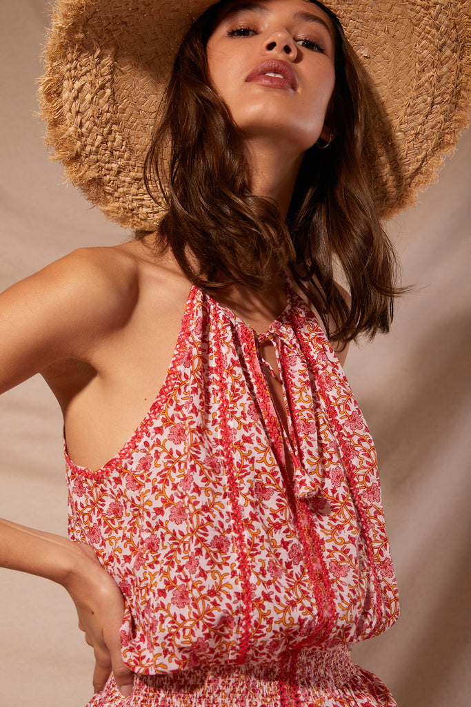 This feminine Carine mini dress from Poupette St Barth features a deep V-neckline, bordered by a pretty pink crochet that continues onto the middle of the dress. Featuring slightly pleated details, a pink floral print and an adjustable tie at the neck, this is the perfect summer dress for any occasion.